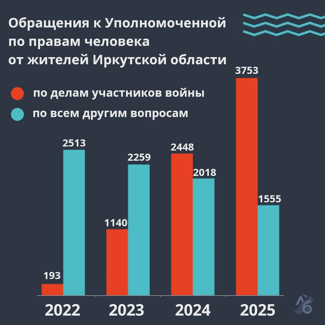 По данным доклада уполномоченной по правам человека в Иркутской области Светланы Семёновой, в 2025 году омбудсмен получила 3753 жалобы, связанные с войной, и 1555 обращений по другим вопросам.